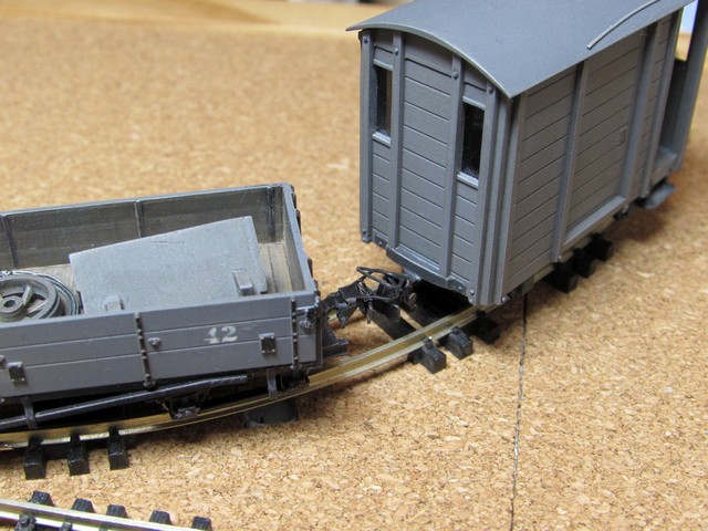 As I was ordering a few pieces from Narrow Planet, including a cast brass brake handle for the brake van, I added a pack of Greenwich couplers with NEM pocket fittings to the order, and a pack of magnets. An hour or two of bending brass later both the WD and van were fitted with couplings and ready for testing.