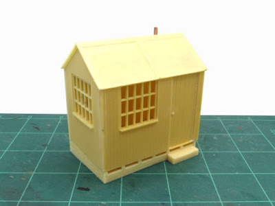 Over the last week or so the workbench has been host to the Port Wynnstay office building for the O9 pizza layout. This is a simple resin kit that goes together easily although I did have to flatten the sides and ends before assembly as they had warped in storage. This was achieved by submerging them in a Pyrex dish of boiling water and then removing them with tongs and laying on a glass worktop protector weighted down with weights from old OO gauge Lima diesels.
